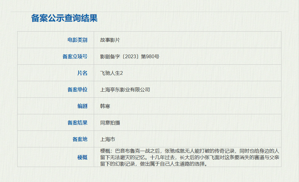 国家电影局关于2023年3月下全国电影剧本(梗概)备案、立项公示的通知:韩寒编剧《飞驰人生2》同意拍摄。