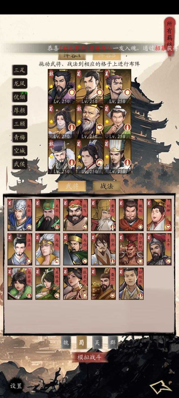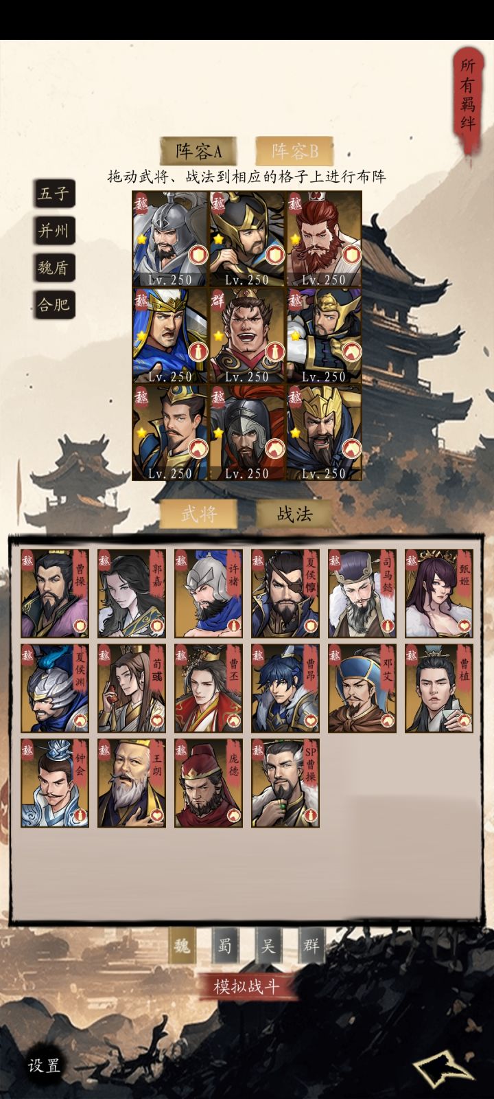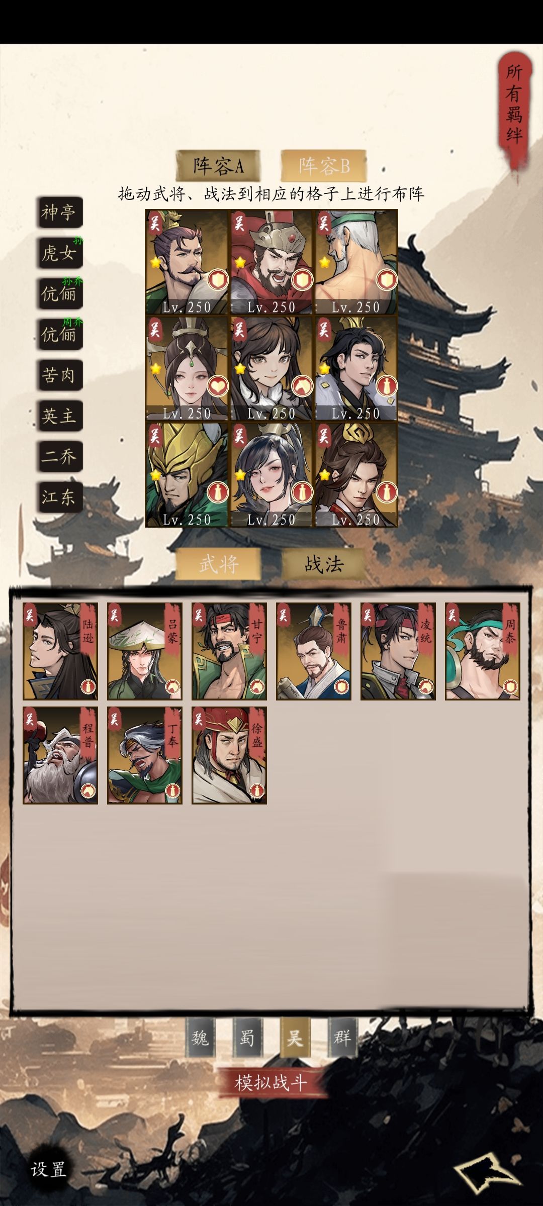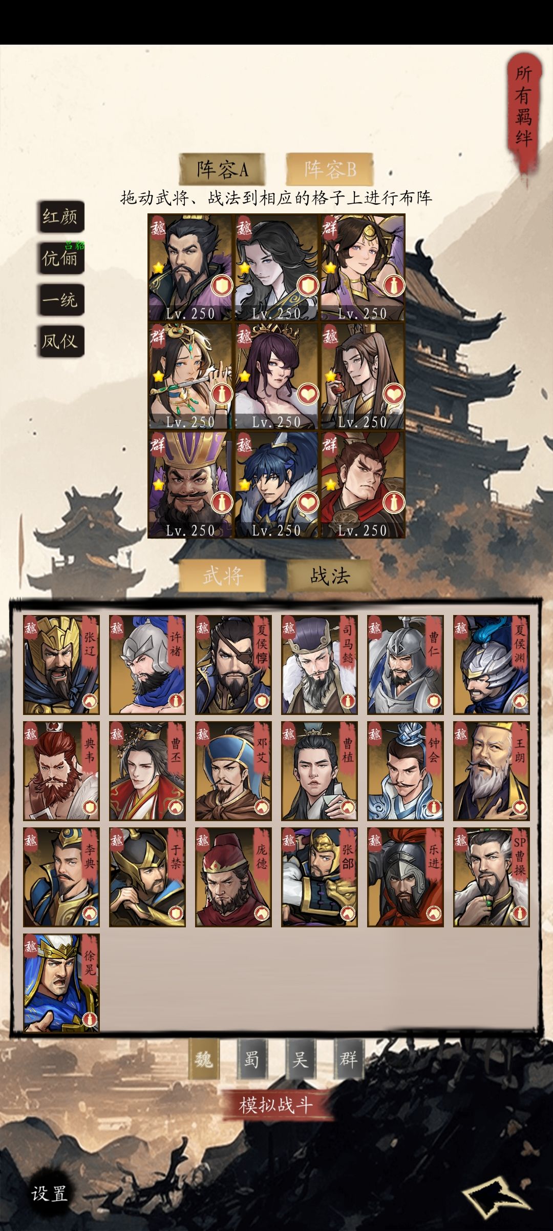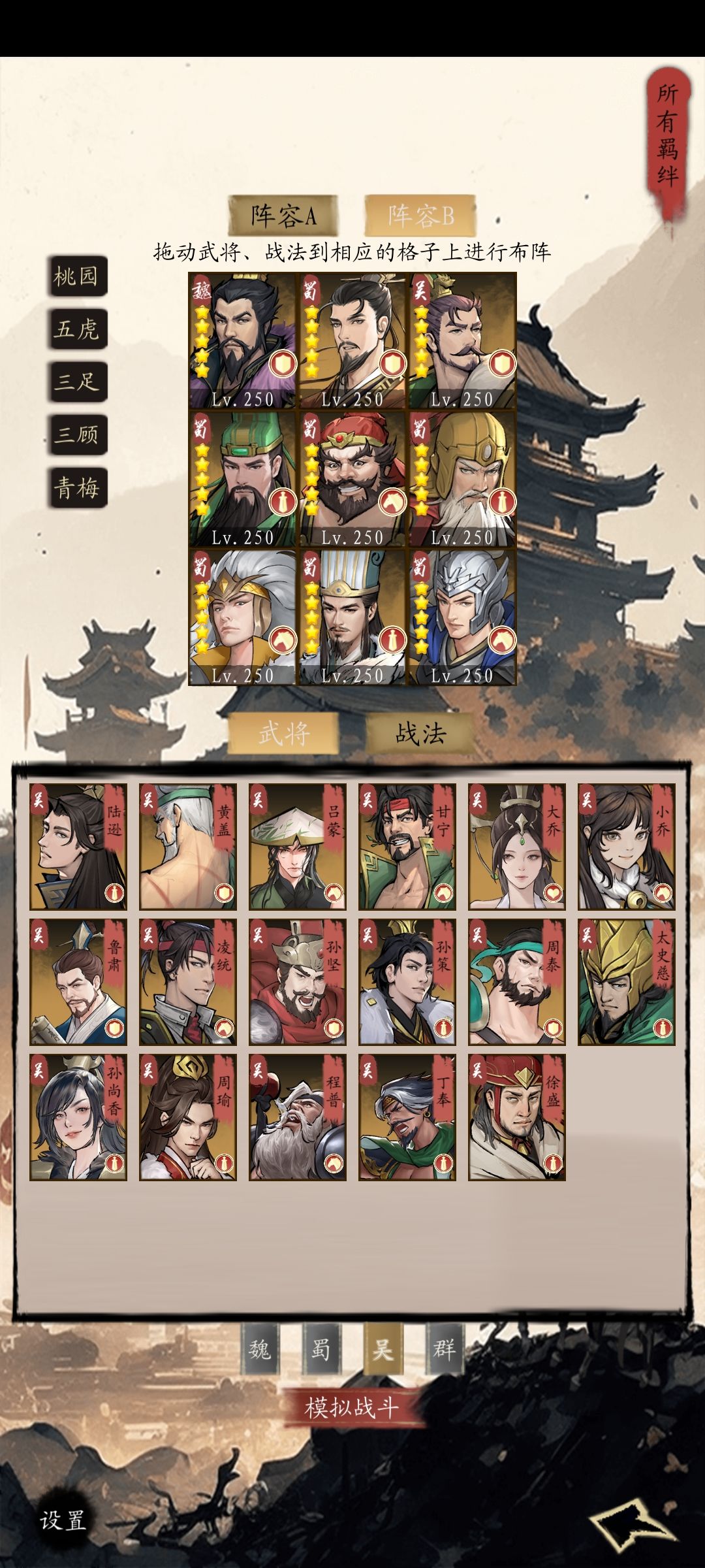 阵容方面有大家比较熟的,魏国五子,蜀国五虎,吴国四都督等,也有一些特别的,比如魏国曹植司马,蜀国诸葛庞统,吴国大乔小乔等等,也可以走流派,比如反伤流,法伤流,物理流等等。