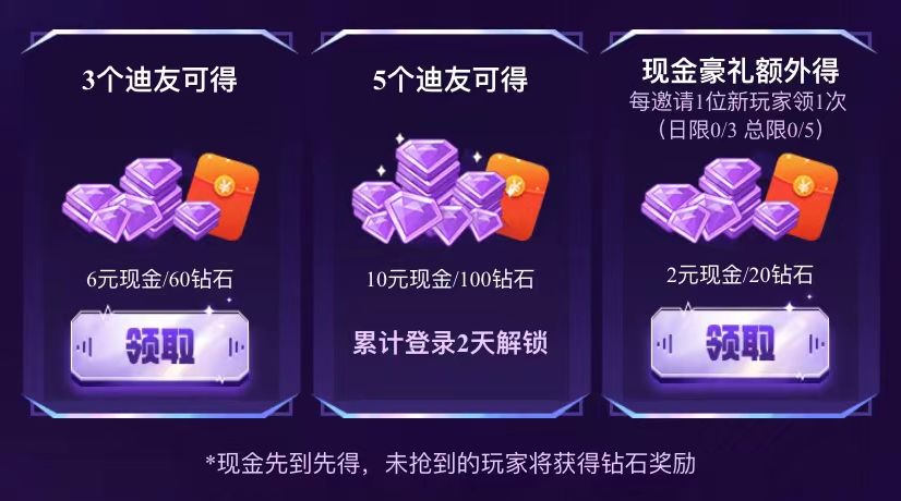 此外,玩家邀请的迪友达到指定数量,并符合页面登录条件,可以兑换现金奖励(迪友定义为:2023年5月13日0点后新注册账号的新玩家或2023.5.6-2023.5.12未登录的玩家),邀请的迪友中,每有一位符合新玩家条件,邀请者还可额外领取2元现金奖励(新注册账号的新玩家需为5月13日0点之后注册,单日限制领取3次,总限制领取5次)。