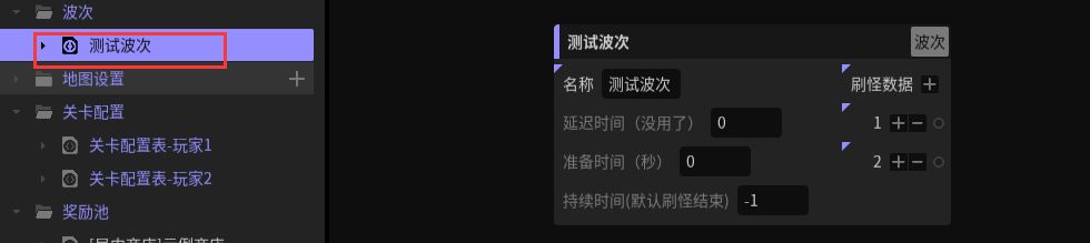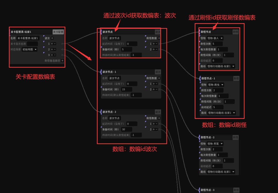 同样道理波次表可以获取刷怪id数组,了解这个结构之后,你就可以获取和修改任意一个节点的数据,然后也可以动态增删节点,只需要在公共节点预设好对应的数遍表,然后往数编id数组里添加数编表就可以了