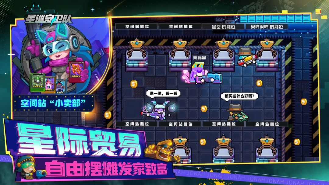 工作室的小伙伴们无不向往着星辰大海,《星巡守卫队》就是在大家天马行空的想象中诞生了。得益于像素引擎强大的可塑性,我们规划了「夜莺号」舰桥、空间站、行星地图等一系列未来场景,以及翻滚、射击、随机彩蛋、策略BD等一众经典枪牢元素,献祭小伙伴们为数不多的头发后,纷纷搭建完成。