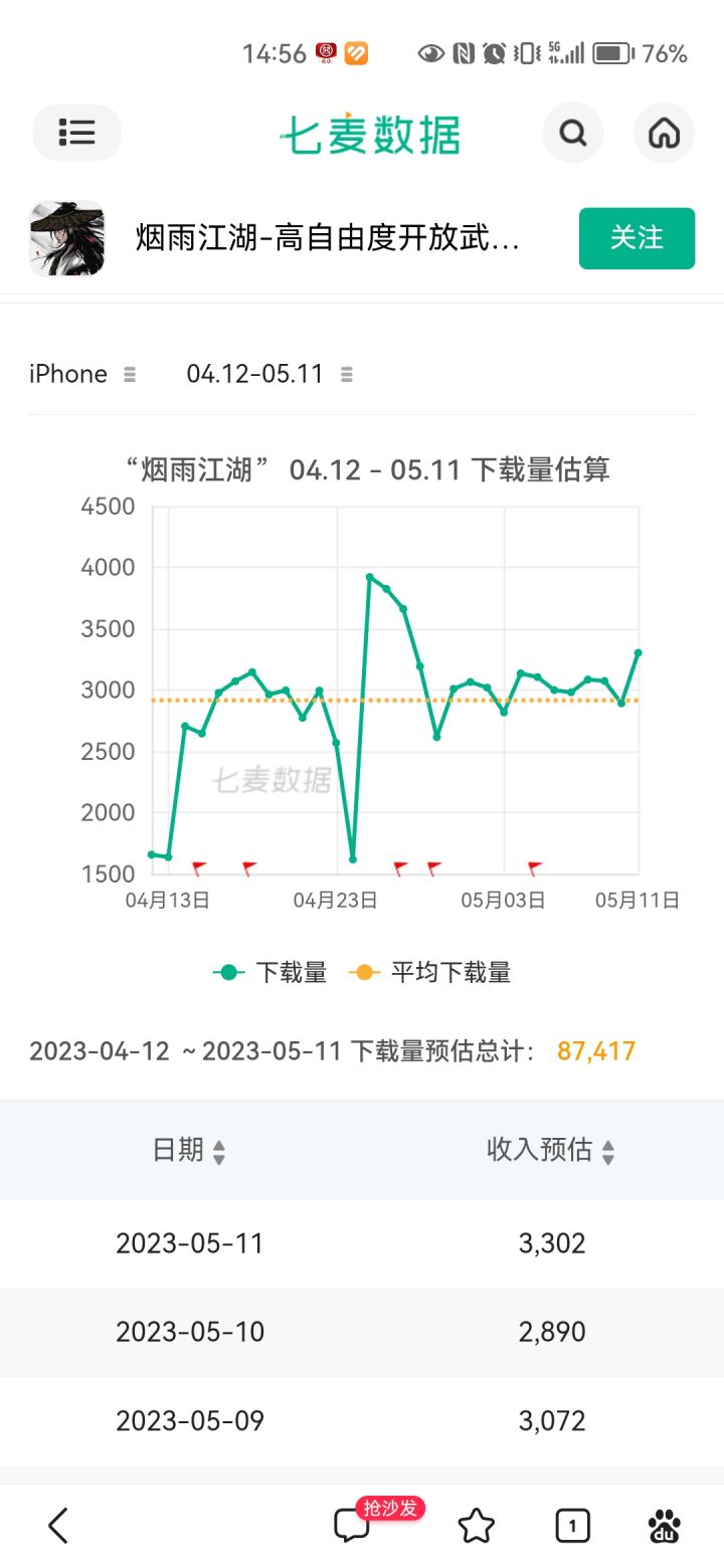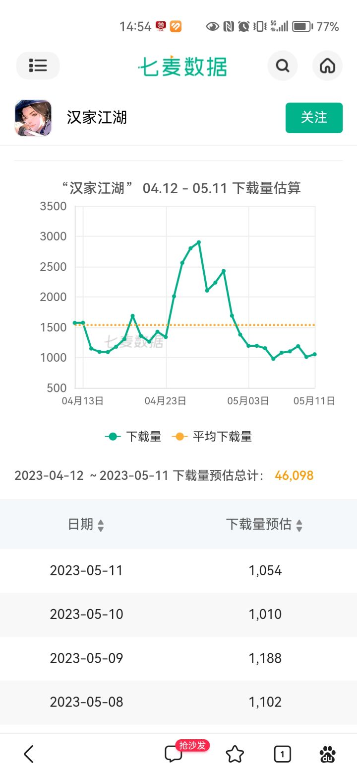 首先看第一张图,汉家近月苹果端的下载量,在五一前陡增,这段时间刚好也是烟雨江湖负评的时期,部分烟雨玩家转战汉家试玩。