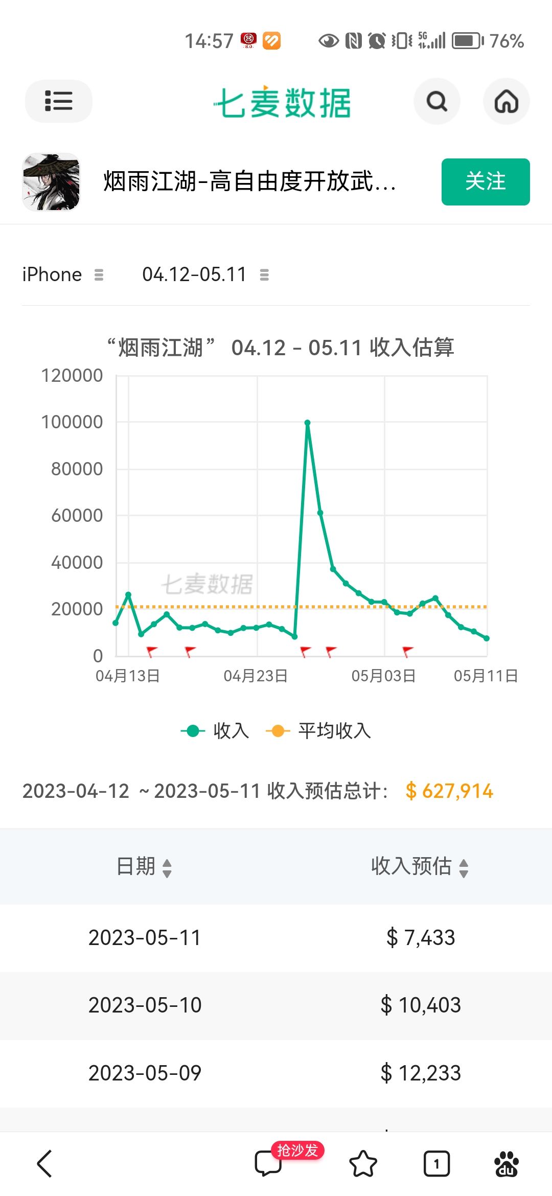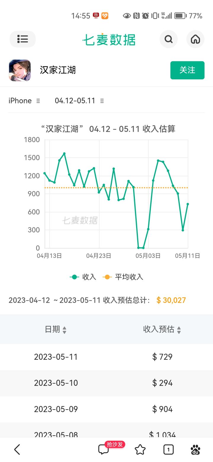 再看第二张图,汉家近月苹果端的收入,节前的下载量小高峰并未让其实现创收。也许是汉家的ke度不高,也可能很多烟雨玩家在试玩后失望放弃,也可能是烟雨玩家在观望周年庆开新区…总之,如果SS利用周年庆能够留住这些观望的烟雨玩家,我相信6月的数据会很漂亮。