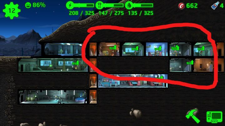 发现幸存者模式真的需要这种布局,单单x型布局只能防火防蟑螂,当时玩想要快速解锁建筑,人口留的比较多,但是很多人都比较弱,结果大门外面来的食尸鬼把我这溜了个遍,从一楼杀到底层再杀回一层出去,又要点辐射宁,又要点治疗针,往外拉人也难拉,x型建筑旁边都满人,拉过来几个就要挤出去几个,拉慢了直接被辐射死。最恶心的是食尸鬼连续来,刚结束时间没多久又来了一次,辐射宁都用完了。后面在贴吧找了这个布局,避难所内部的火和蟑螂不会影响其他地方,外部来的不管是死爪,强盗还是食尸鬼,都要走一个来回才能往下面层走,但是怪物根本走不了一个来回就死了,每个房间内部也就一两人,用药方便,不会出现人多来不及点就死人的情况,除了这个部分,其他部分基本都是x型房间,大多都是1级2级房,出现的灾难刚生出来长大的小人也能迅速处理,直接升人口到100全解锁建筑,升级装备和武器制造房能制造传说武器装备,升完建筑之后小人留不留都行了。就算不想快速升人口也能防止外面来的怪物,减少了不少难度。