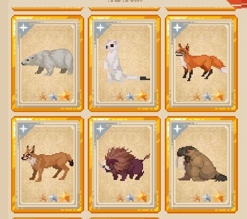 第一个很显然是北极熊。第二个个人推测是雪鼬。之前考虑过雪貂,因为白色的雪貂的跟雪鼬一样都是全身除了尾巴尖为黑色,其他毛发颜色皆为白色。但是雪鼬的尾巴更长,同时雪貂还存在非白色皮毛的普遍个体,因此选择雪鼬。第三个个人推测原型为赤狐,但尾巴尖的白色与现实有差异,应该是艺术加工的结果。第四个是猞猁,也就是山猫。体貌上皮毛颜色为灰色,褐色,棕色为主,耳朵尖为黑色,尾巴短小,尾端呈黑色,分为四类:欧亚猞猁、加拿大猞猁、南欧猞猁和断尾猫。游戏内的个人推测是欧亚猞猁。第五个为野猪,理论上野猪从热带到温带都可以生活。考虑到丹麦,瑞典,挪威三者前身为维京人,且丹麦也有阻止野猪入境的新闻,维京地图出现野猪也不是不行。值得一提的是最早的地图宣传,野猪并未出现。第六个就是海象了,北极生物,目前与北极熊一样,同2008年被列为濒危保护动物。