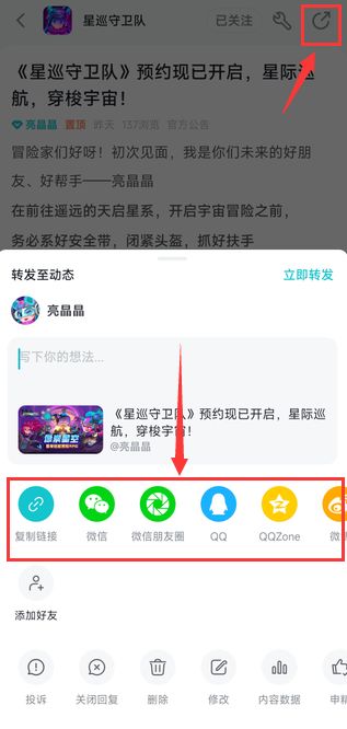 ①将该帖转发至QQ群/QQ空间/微信朋友圈/微博等社交平台