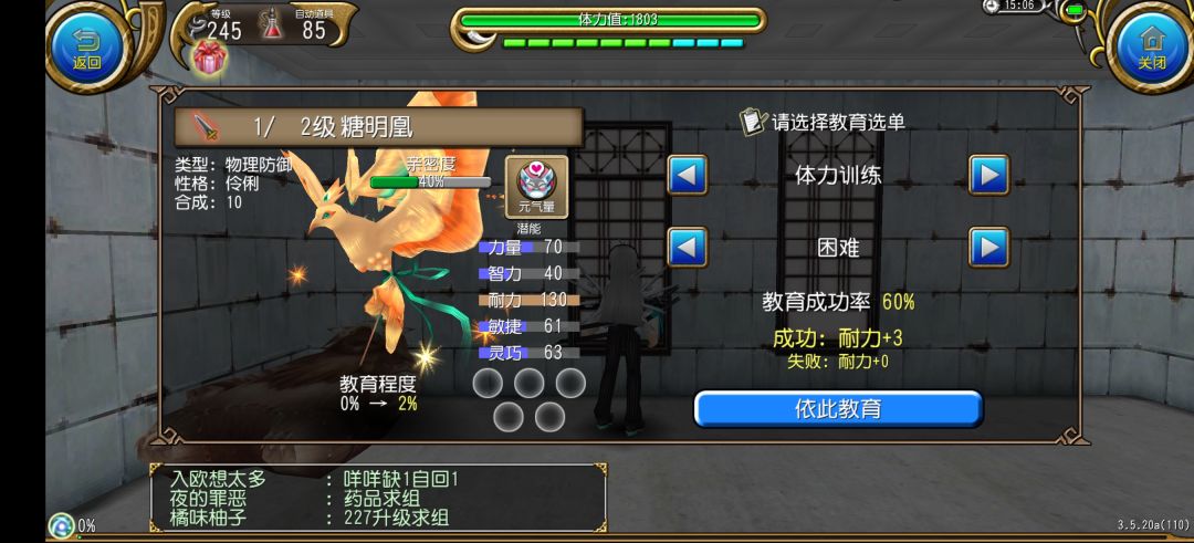 技能好了之后可以进行训练了,一定要喂出教育成功率+50%后再训练,要选择困难训练,根据需要选择训练内容,例如buff宠,要训练体力,困难训练本身有60%成功率,加上50%后一定成功
