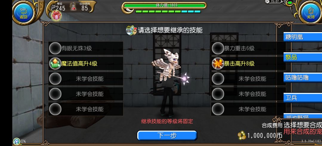 除自身能学习的三个技能外,还可以从亲代继承两个技能,但是继承的技能不能升级,因此要亲代技能满级后进行合成。