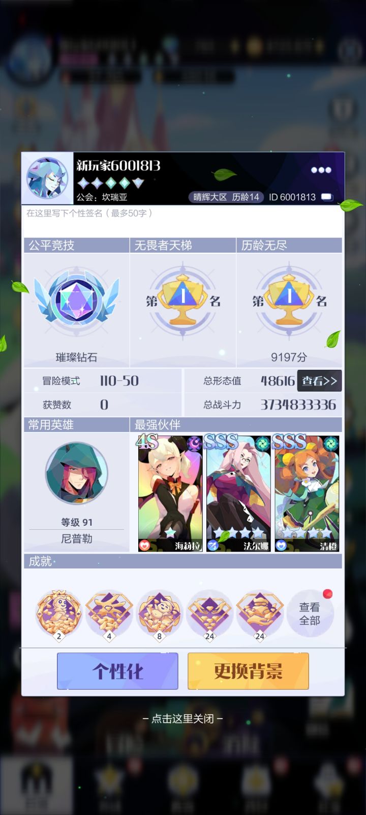 差不多就这些。之前第一天我没打到上限。第二天是3e74关,第四天是6e89关,第七天是12e98关,第十天是24e109关。我神器拉得不够,伙伴也多浪费了点钻石,疾速套也没有,生存本能和召唤强化都不太够。其实10-14天我也只多买了一些虹彩辉晶,升了一轮伙伴沙盘装备,英雄升到了91,没有太大提升。感觉10天还是有机会打过的,如果大家伙伴装备沙盘等级多一些,装备神器命石好一些的话希望能帮我达成未完成的愿望。虽然今天过109确实也是比较侥幸,109关消除拉的满,打团打得好恐惧了前排秒了几个小龙人。