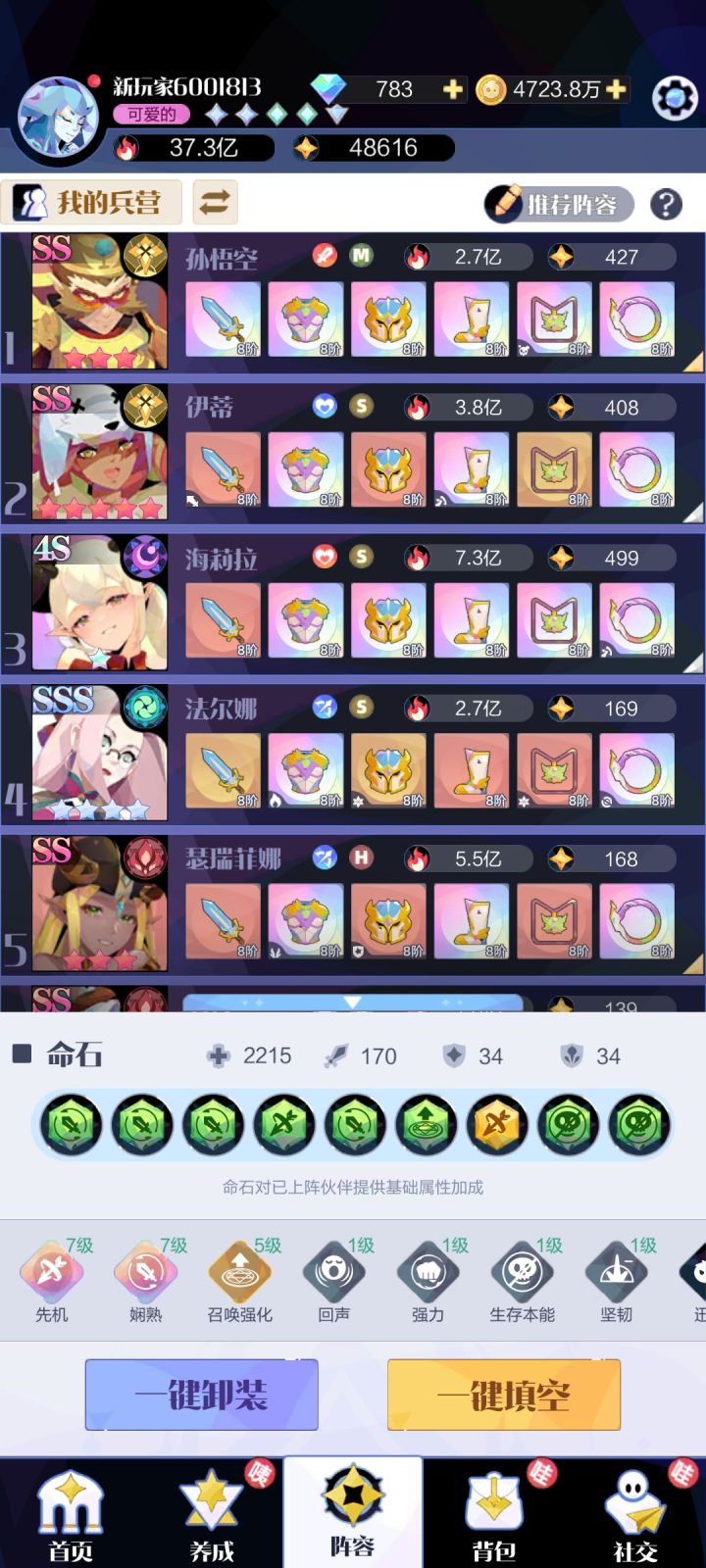 命石方面,开局最好至少有2娴熟1先机,有条件可以刷一下,后面至少需要再有一个先机。理想情况,可以再有两个娴熟,一些召唤强化,一些生存本能都挺好,回声前几天boss和小关有用。阵容上,就是4个娴熟(不上观风)配合2娴熟命石,3-4个先机伙伴,再从橙子伊蒂班加德里选几个,ss2比蒙也可以但根本升不到ss2。