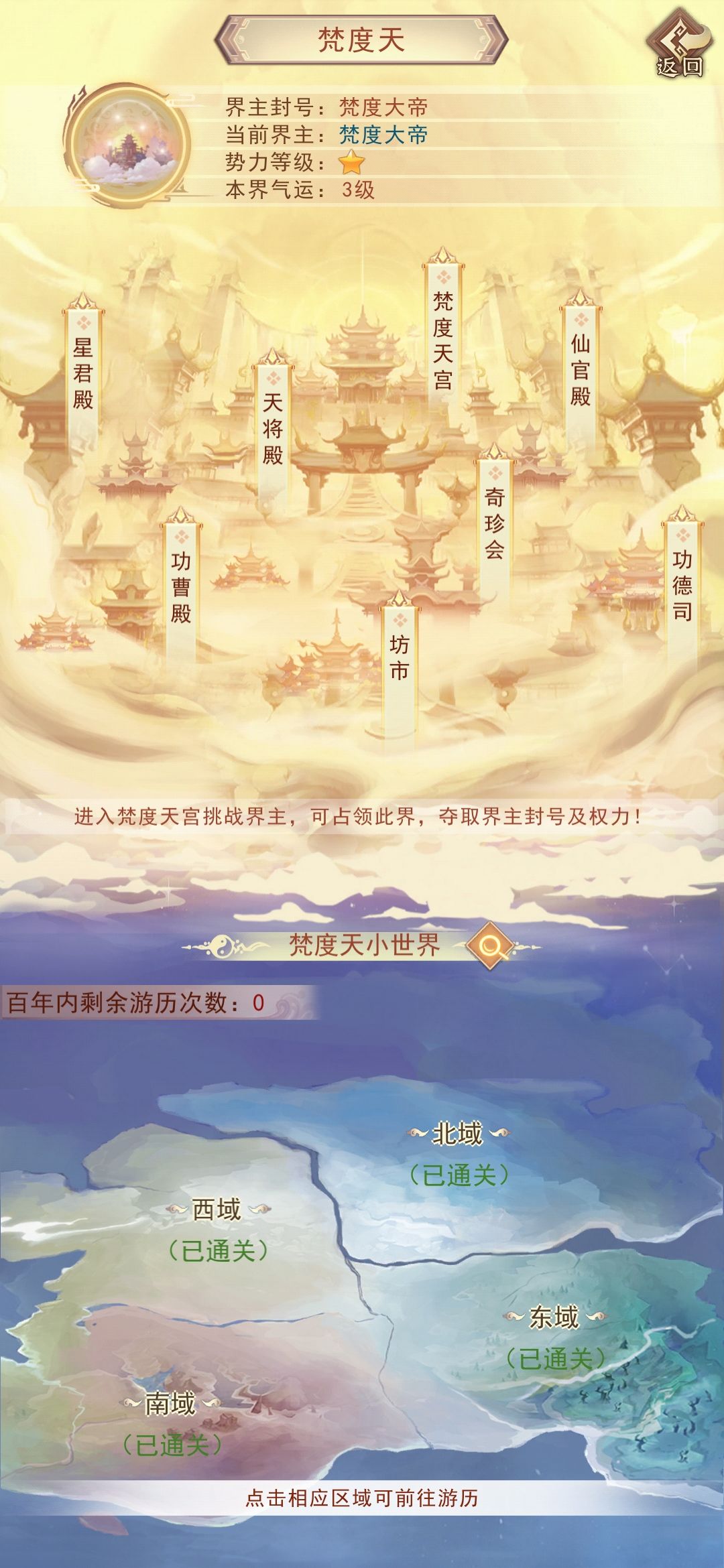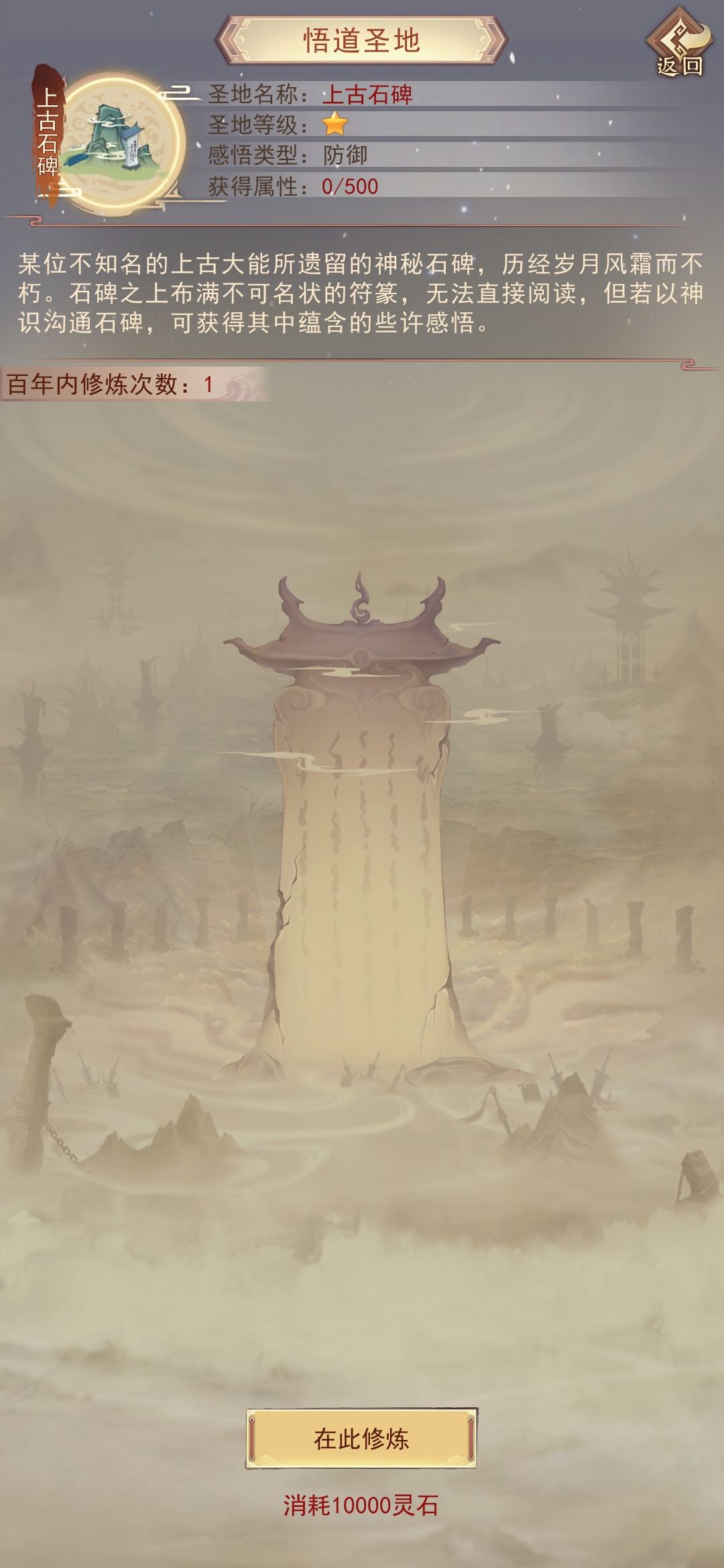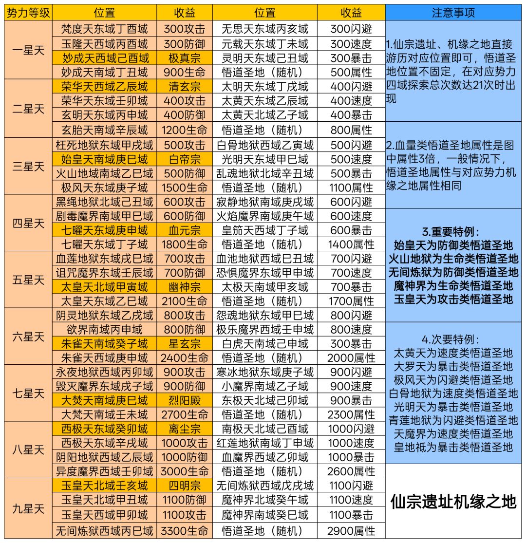 第21次(四域总次数)游历方可找到悟道圣地,悟道圣地消耗灵石获得属性,领悟不消耗游历和机缘次数,每天可领悟每个圣地各一次。