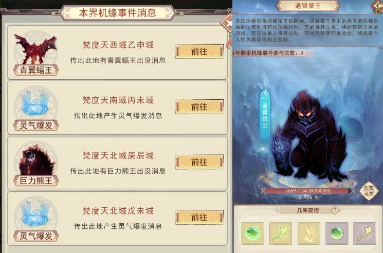 注意,打世界Boss消耗机缘游历次数,奖励在Boss被击杀后发放,奖励与造成伤害量相关,获得的材料可以在仙宗门派宝库兑换法宝。