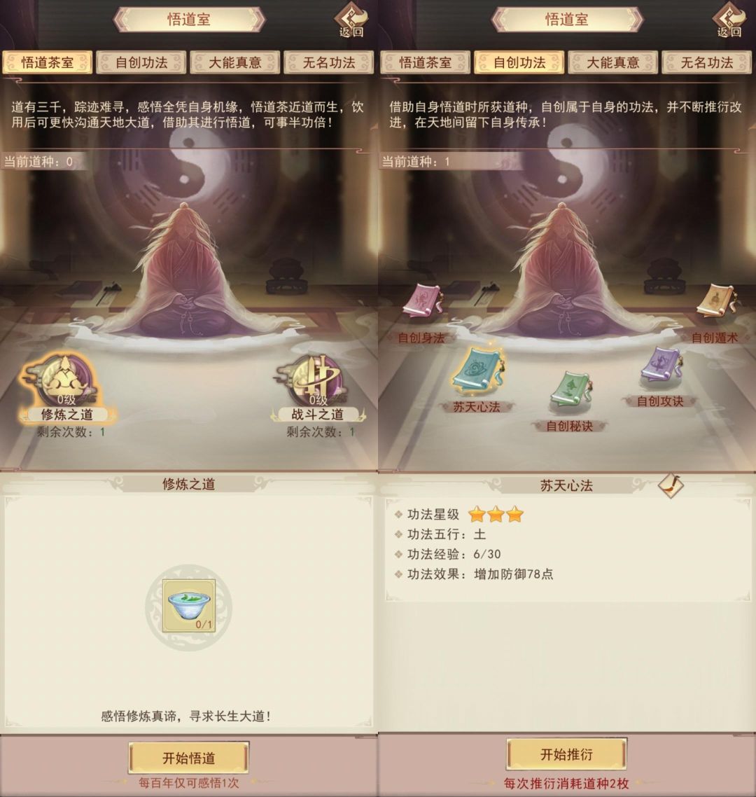 喝茶给10枚道种后可以自创1本功法,自创功法升级也消耗道种,优先自创升级心法攻诀秘诀。