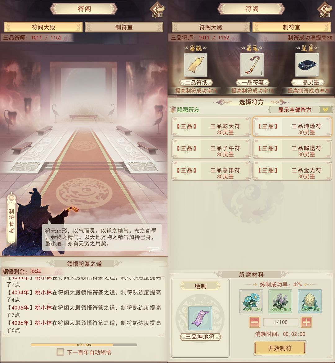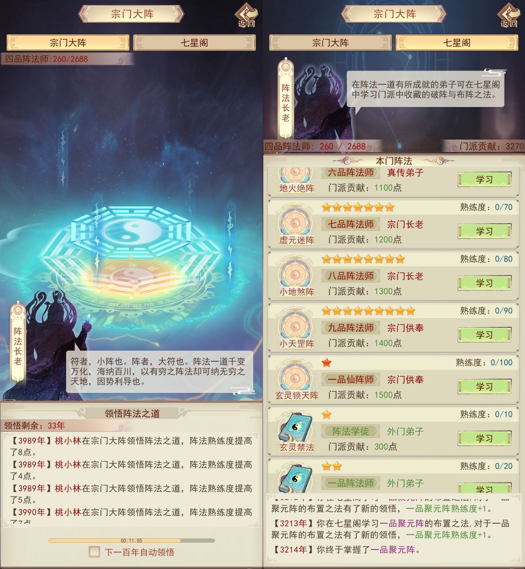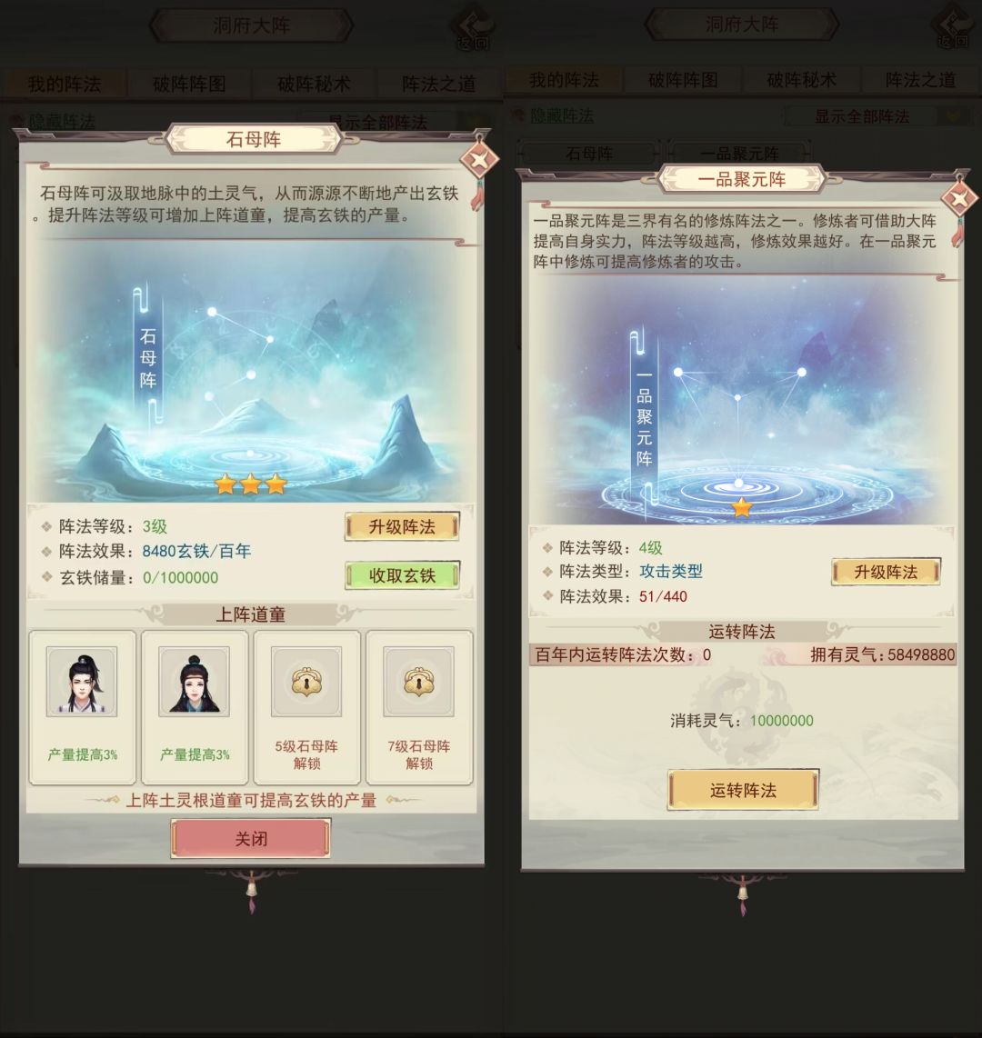 学习阵法后可在洞府布阵,阵法分为石母阵和属性阵,石母阵可升级,可上阵道童增加玄铁产量。