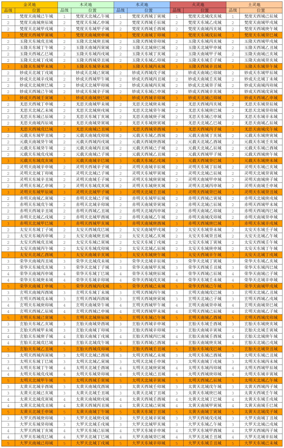 五行灵地产出如下: