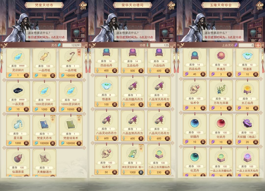功德司大乘前先只买茶,丹药秘诀后期买,仙术令丹方尽量不买,丹方仙宗可以学。