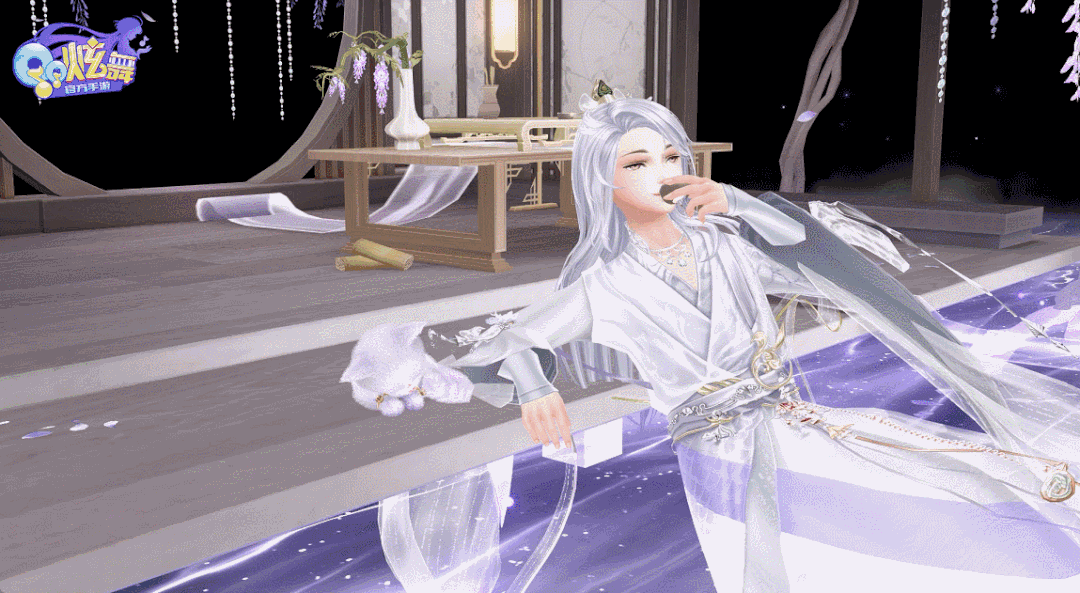 银发如瀑,他将杯中酒一饮而尽,俯过身与小猫儿逗趣。
