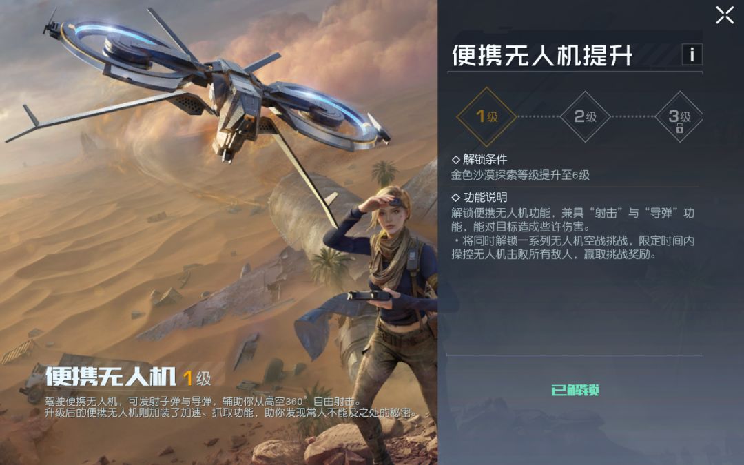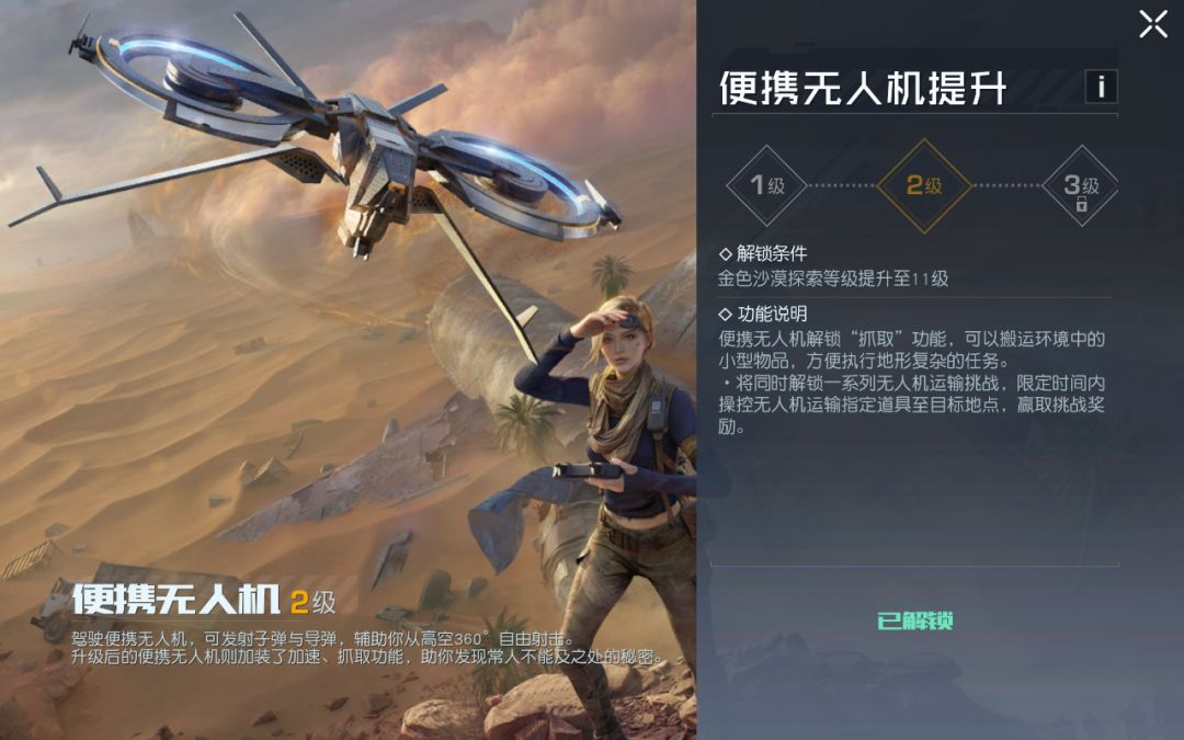 随着金色沙漠地图探索等级提升,便携无人机等级也会随之提升,并获得更多效果: