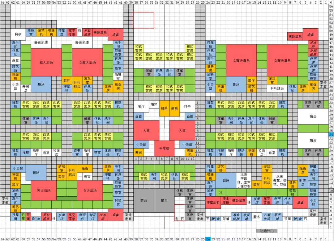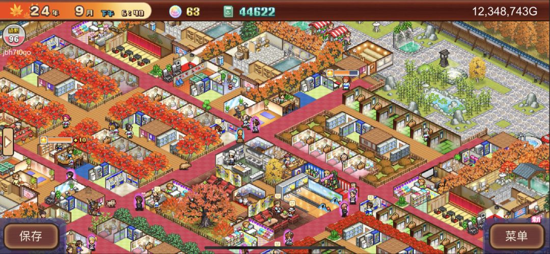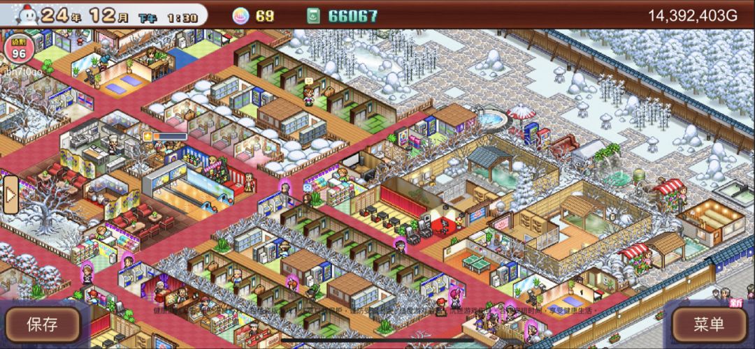 第一次玩开罗游戏,第四周目,总算建了个比较满意的,参考了小红书朋克小猫的布局,按开局的顺序又调整了一下,目前还有一个契合度下降的没有改过来,改天再研究了。下边两个泉眼,用露天温泉盖住后拆除了。入住客人总是20多一点,不知道什么原因,挑战用下边门口单独的三间房,基本上一次过。所有温泉,功效全满(分男女)。等肝出开罗君,哪天无聊的时候开个五周目,开局用露天温泉,研究点数就不愁了。一直到截图的时候才发现可以横屏……一周目以后在设置里可以加速,还可以上传存档,双端互通,真心不错👍最后是朋克小猫的原图