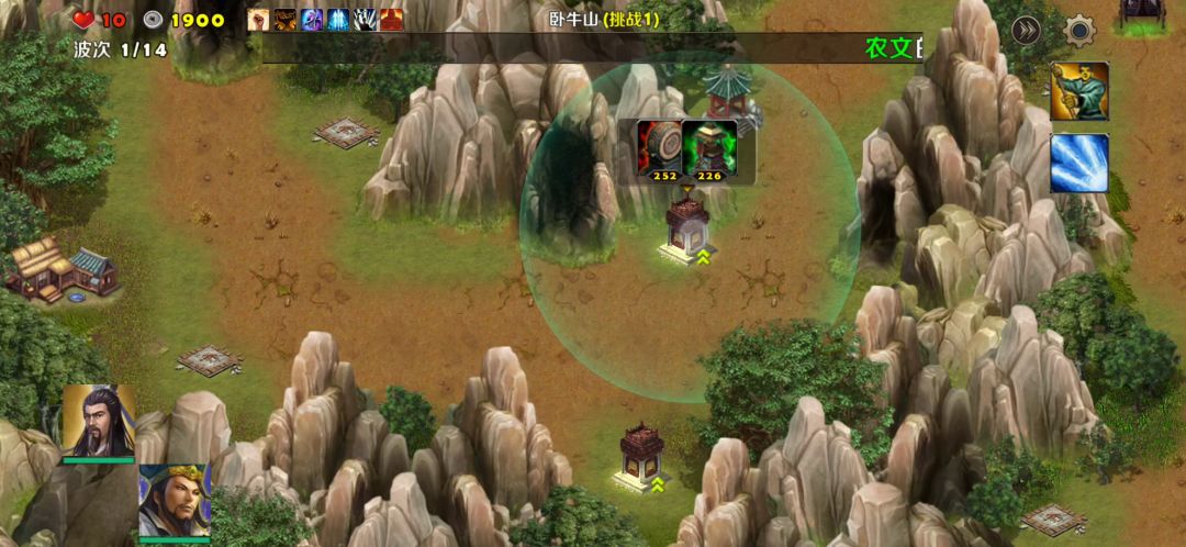 打法思路:开局刘备去右边出兵口,诸葛亮去左边出兵口,然后在右边先建造一座地刺塔技能点一级,剩下的金币在左边建造防御塔技能一样点一级在点开始战斗。有了金币以后我们先把右边地刺塔技能点满顺便在下面在补一个防御塔刘备就可以调到左边出兵口和诸葛亮集合以后把右边新做的防御塔技能点满以后就可以不用管右路,专心打左边路线就可以了。