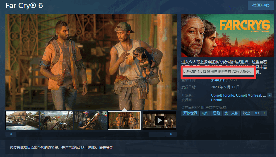 育碧《孤岛惊魂6》已于几天前正式登陆Steam,目前该作的口碑评价已解禁,为多半好评,1512篇评测,72%好评率。