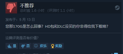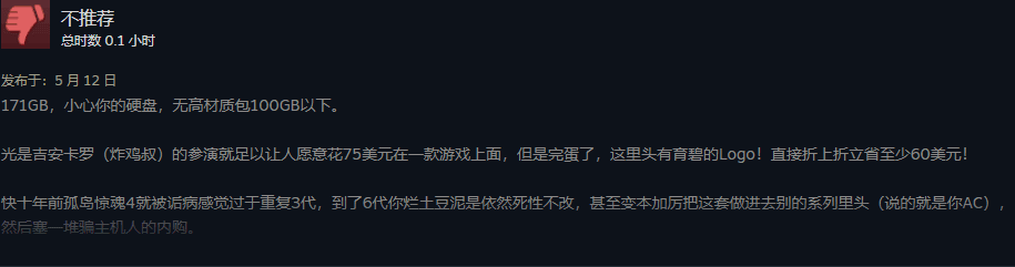 给出好评的玩家表示,这算是育碧近期还不错的游戏了,也有人是冲着“炸鸡叔”买的。给出差评的大部分玩家都在吐槽默认下载的大容量高清材质包导致卡顿,游戏的服务器也不好。