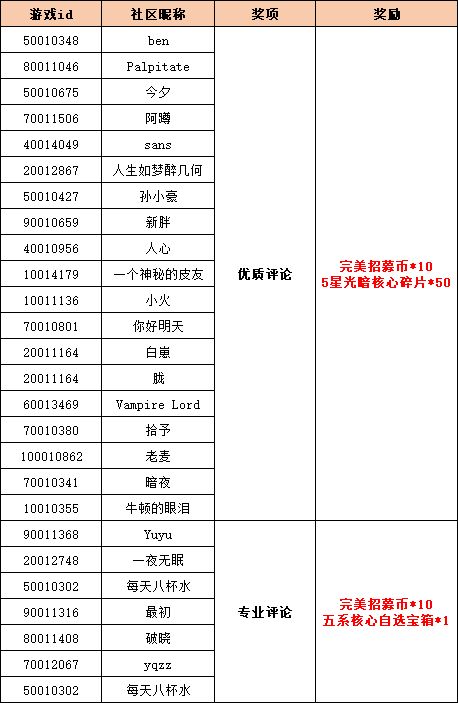 活动结束后,依照游戏时长、评价点赞数评论数、评价字数以及质量评选出15个优质评论赠送其作者完美招募币*10、5星光暗核心碎片*50