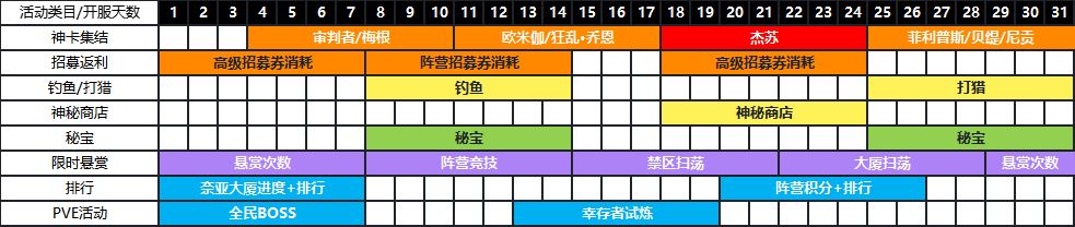 本期为各位幸存者带来【末日来袭】活动排期以及攻略汇总,以下是开服前30天以及后续循环周的主要活动类目: