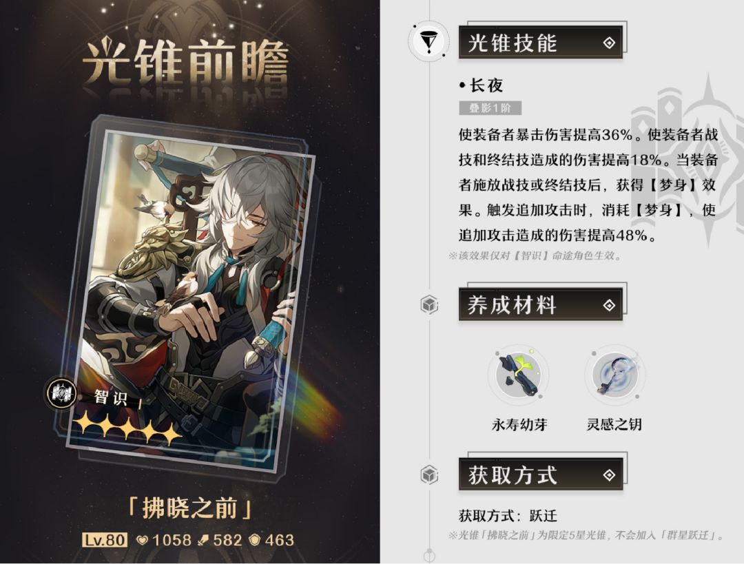 尽管拂晓之前可以凭借自身的优秀面板当之无愧的成为目前所有智识角色的最强光锥,但未来总会有更好用且泛用的光锥,现在就为其他角色抽取意义不大。