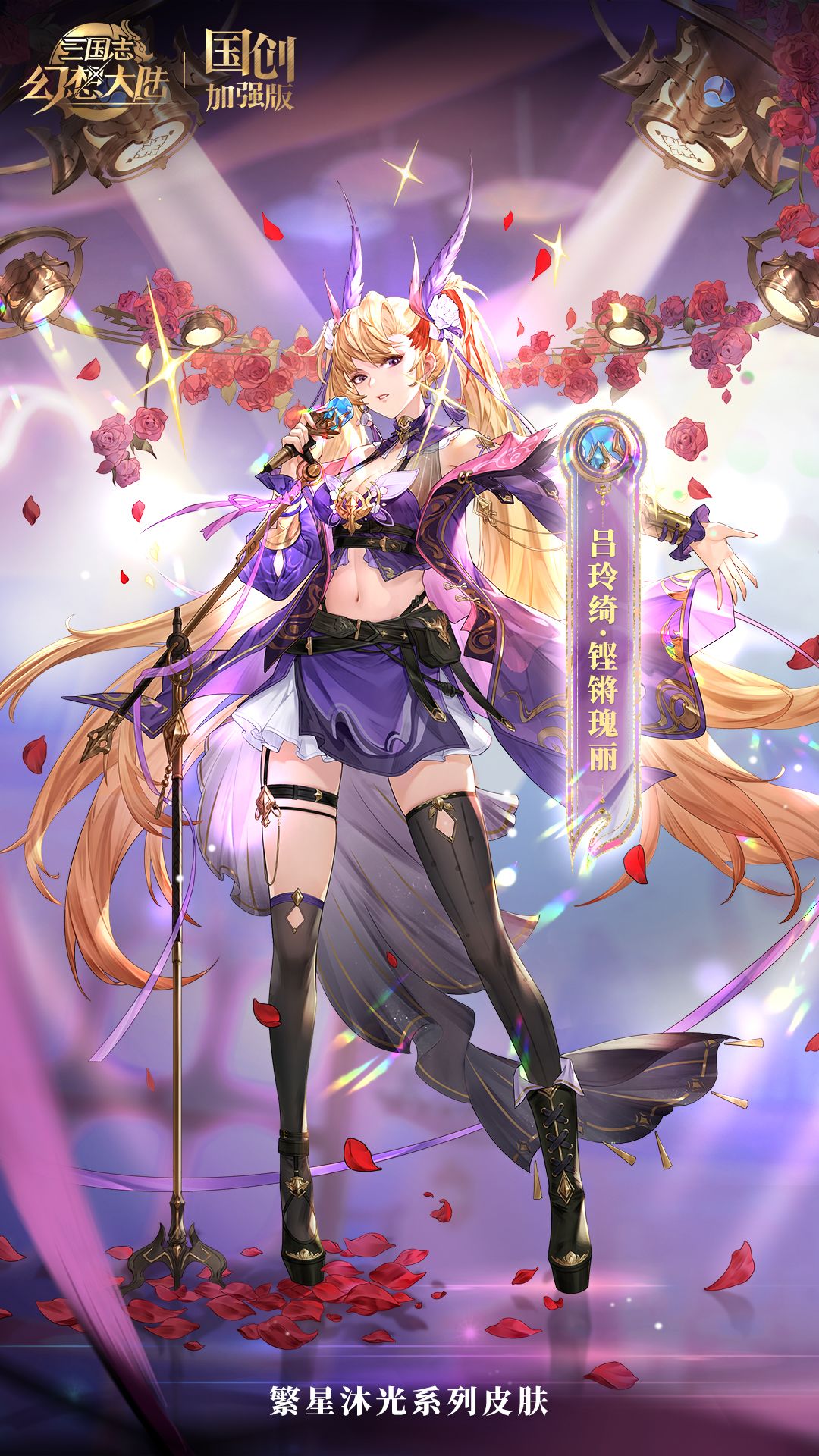 皮肤的整体风格为粉紫色,以红玫瑰、舞台为皮肤主题。身为主唱的吕玲绮身着紫色演出服,标志性的双马尾也由紫色翎毛扎束,一袭灰色纱裙也在舞台灯光的点缀下熠熠生辉,两条芊芊玉腿也在黑丝包裹下颇显高挑颀长。手持麦克风的玲绮在舞台上倾情演唱,与其冷酷少女的人设形成鲜明对比,也将其英气十足、铿锵瑰丽的性格体现了出来。
