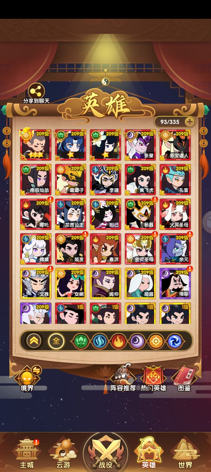 前期不会玩把置换卡搞废了,拿太乙去换云霄,就是因为看了别人的帖子,想玩雷子(平民算了因为还要搞一个闻仲养不起来,还废时间)。阵容站位主C燃灯(2号位)+副C张奎(3号位)+桃子(1号位)+多宝(后排中间)+长耳(五号位)。高阶演练币换阳系随机英雄,张奎和多宝每个星期可以嫖一个,有竞技币翻倍活动的时候,可以搞一波竞技场25000砖石,八卦只能得一个,玩竞技场可以得两万币加上成就相当于25000砖石得了两个多宝,稳赚!!!然后就是周天塔和其他活动送的八卦就只用来抽燃灯就行了,干到三星就可以停了,攒着看看以后有没有新英雄适合代替桃子,想玩得快乐点建议买个月卡拿首充阴阳自选卡