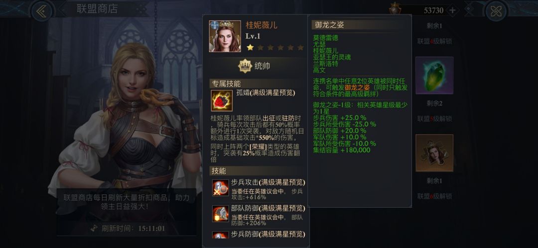 传统的阵容搭配前期可以有开荒采集队,还有PVP战斗队、防御守城队以及打野队,而刚好这四个队伍的角色可以在英雄议会中委任出场,获得技能加成。如传统的初始输出奥伯隆莫里恩;高级双斯组合;蛮族克星打蛮族推图组合;采集获取资源的首冲累充+奥勒留组合等等。