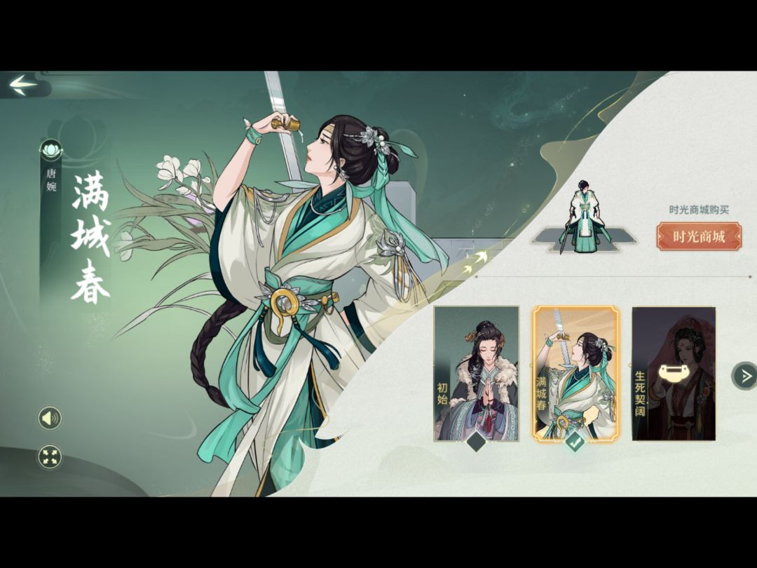 顺带说一句,我并不是特别喜欢唐婉原皮的立绘。很有种......上世纪中年妇女的感觉。再者就是原皮(包括东风恶)里面唐婉作的是妇人装束,固然有大家闺秀的感觉但也少了几分灵气。即便平行世界里陆唐的结局比较圆满,我也还是不太赞成在一个武侠游戏当中涉及到太多平凡的、或者说日常的东西。当然,皮肤审美这个东西仁者见仁智者见智。个人体验的话,在论剑里遇到的唐婉还是以生死契阔为多。这个相信大家也耳熟能详了。《邙风·击鼓》里面的名句。