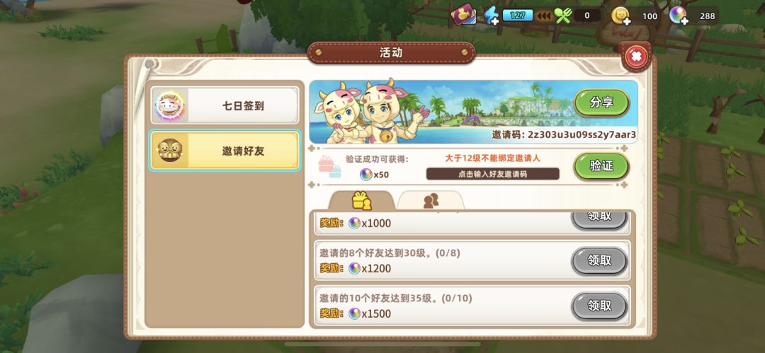 进入游戏,活动里,邀请好友,点击输入好友邀请码