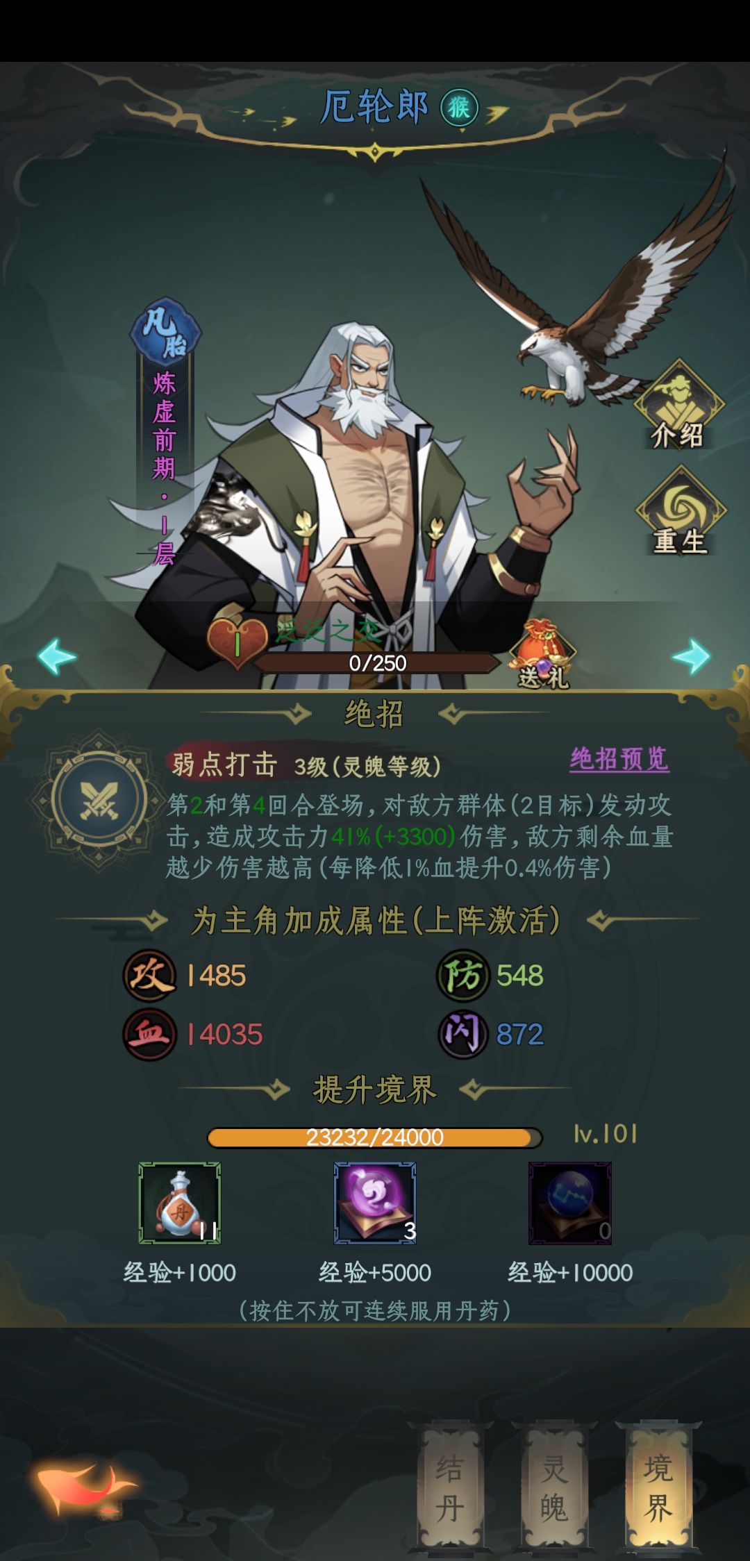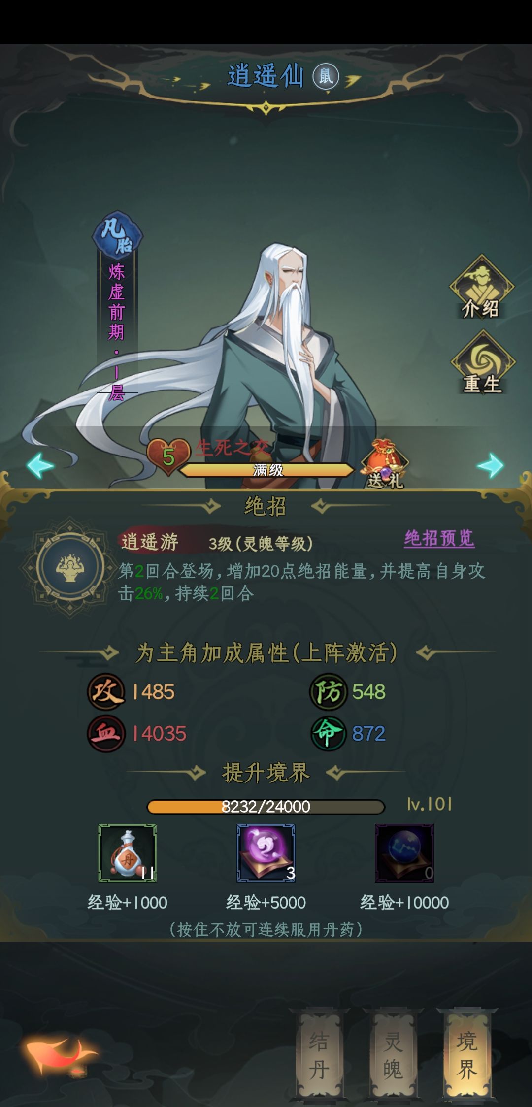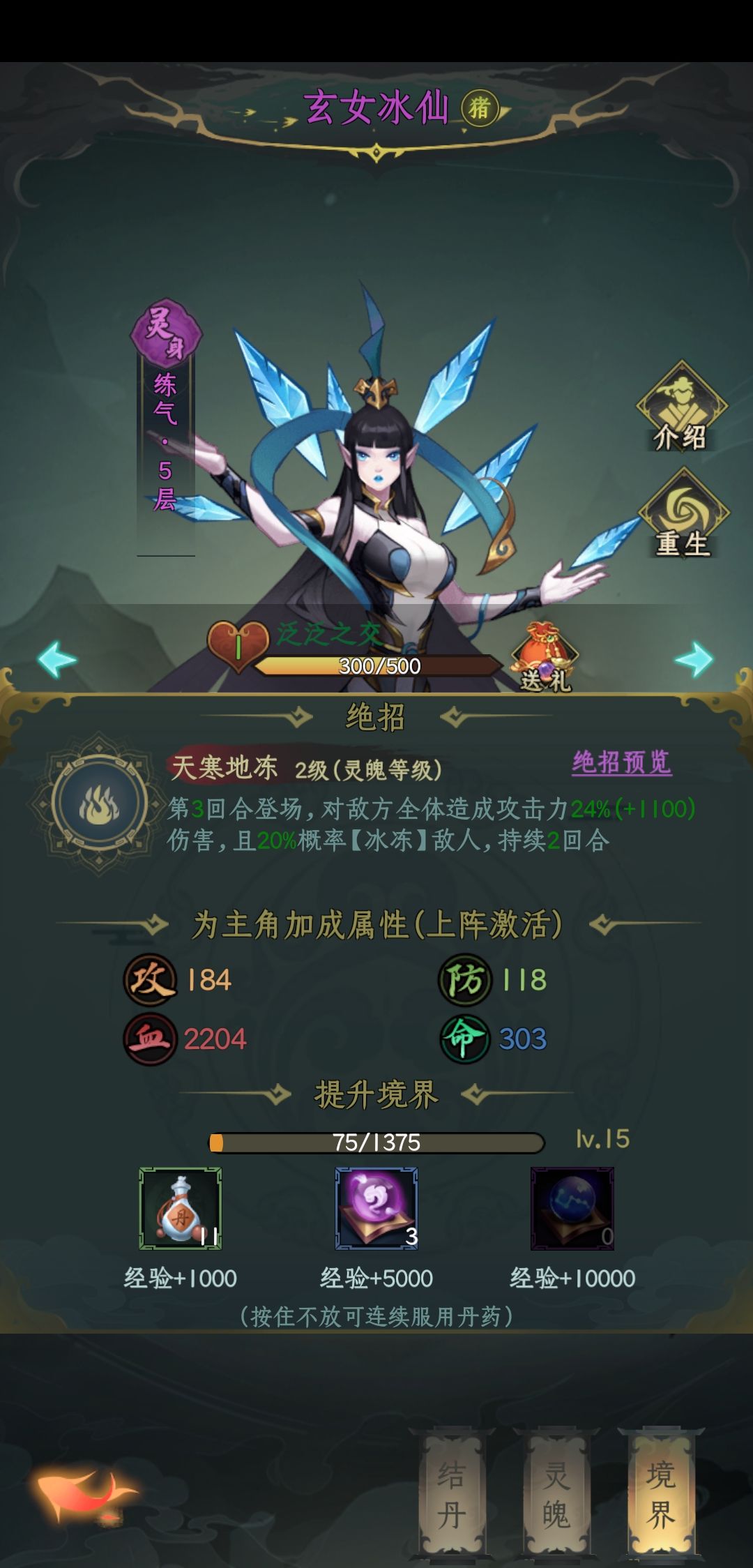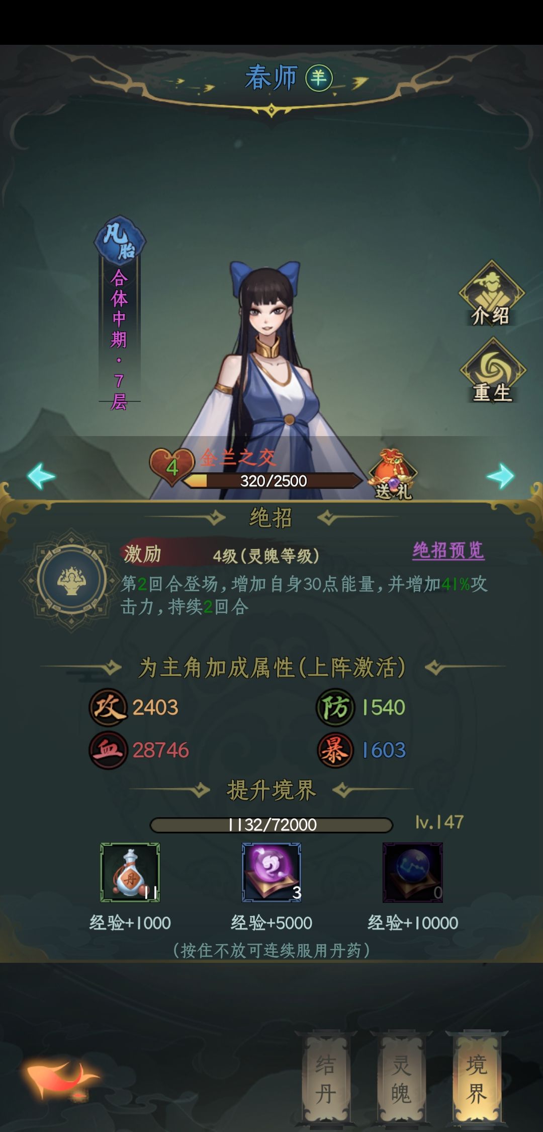 前几天就春师,彩雨,玄女,白雪这样搭配有控制,春师加彩雨2 3回合输出拉满,当然,被白雪控了,12回合就没了,但第三回合还可以输出。(前七天没合适同伴可以这么搭配,资源前七天凡胎重点给春师,灵身重点给白雪,其他的七天之后就不用了)