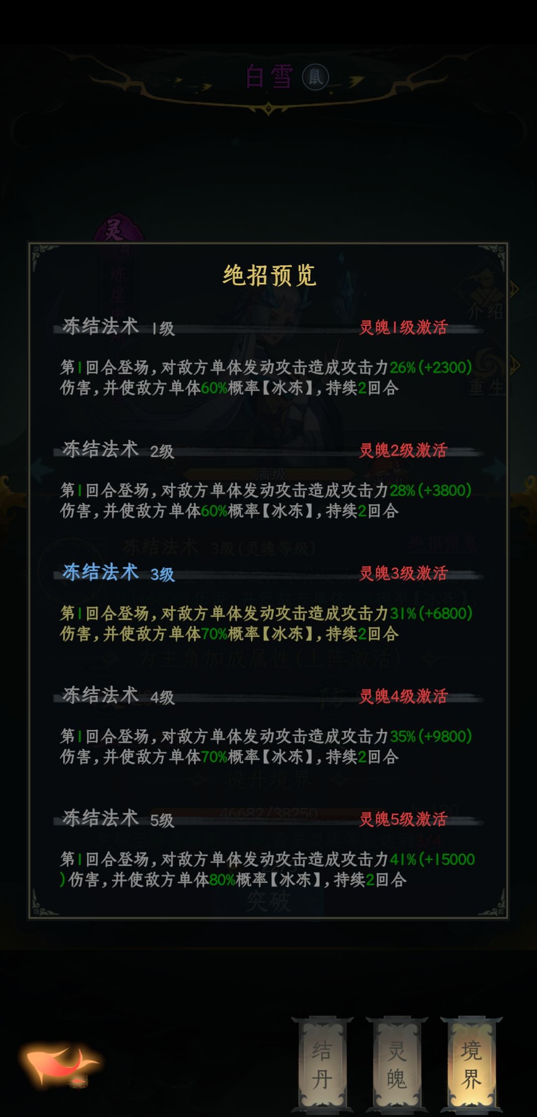 由于技能重复,冰帝白雪不能同时上场,俩都是第一回合冰冻