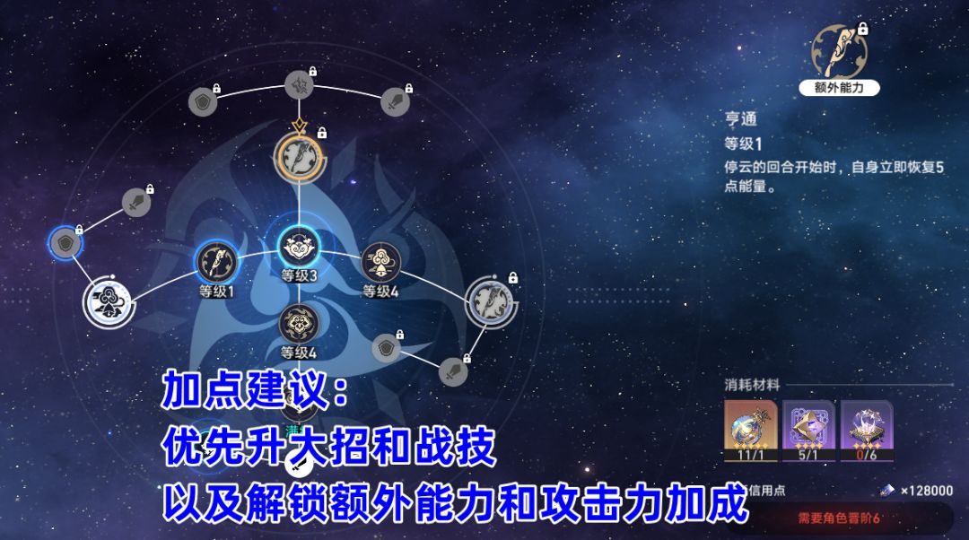 优先升大招和战技,以及尽快解锁行迹里的额外能力和攻击力加成。其中有一个额外能力是停云回合开始时恢复5点能量,非常实用。至于附加攻击的天赋,有资源的话可以点点。剩下的普攻和防御力加成、雷伤加成都可以不升,除非是攻击力加成的前置解锁条件。