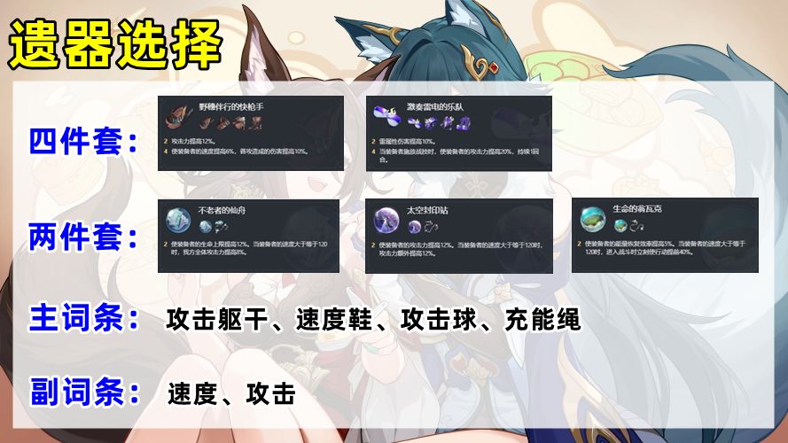 遗器和光锥选择均以优先充能和攻击为主。遗器方面,四件套推荐用赠送的快枪手套即可,当然如果你给景元刷雷套的时候,多出一套能用的部件也能给停云用。两件套推荐不老者的仙舟、太空封印站或者生命的翁瓦克。主词条推荐:躯干攻击力,脚部速度,位面球攻击力,连结绳充能效率;副词条找速度和攻击即可。