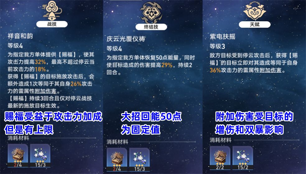 详细的技能效果这里就不赘述了,主要提一下几点要点:1.停云的增伤buff大部分都是受益她自身的总攻击力加成,也就是说停云需要堆一定的攻击力(但不是无脑堆,因为有上限);2.大招为我方单体恢复50点能量外加一定增伤,50点回能是固定值,不受大招等级和充能效率影响;3.停云天赋战技的附加伤害会根据受到赐福buff的目标的双暴和增伤影响,但不属于追加攻击伤害。