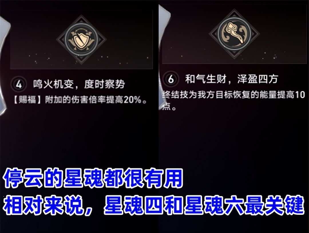 可以说,停云的每个星魂都有用,因为就连星魂三和星魂五常规的加技能等级,同样是在加强她的辅助作用。相对来说,停云的星魂四和星魂六较为关键,前者能加赐福附加的伤害倍率,后者则是让大招回能从50点变成60点,对于大部分角色来说都能充一半大招甚至更多了。