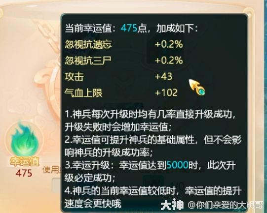 3)神兵每次升级成功后,重置该神兵上累积的幸运值;