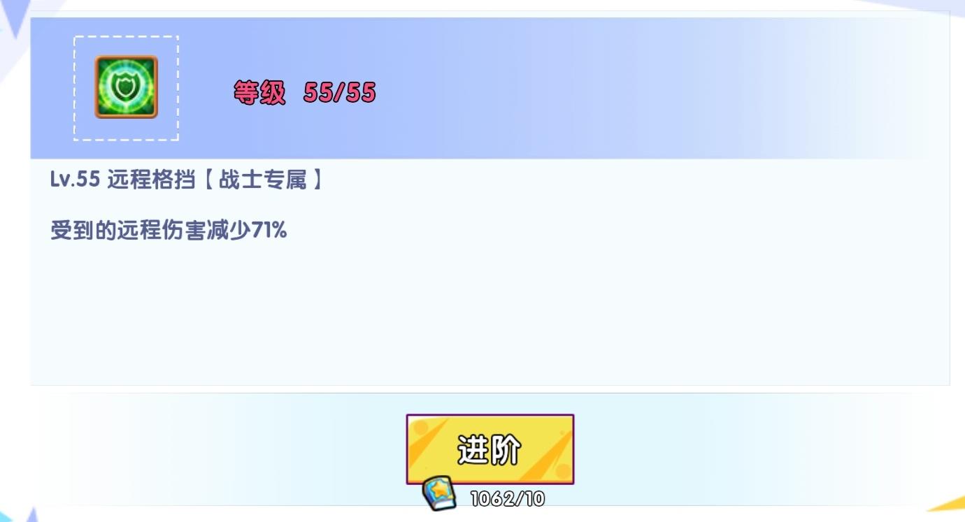 我记得以前远程格挡55上限有bug,有5级升了也不加效果,后来修好了,结果是55级和以前50级效果一样了,现在进阶+五级,觉醒进阶又+五级,65级的远程格挡减伤多少啊大佬们