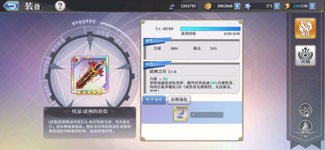 没有附加的主动型技能,但是对于暴击和爆伤的提升却是双重的,不过这件武器较为遗憾的是没有力量百分比的提升,但是作为暴击总量的提升还是很有意义的。