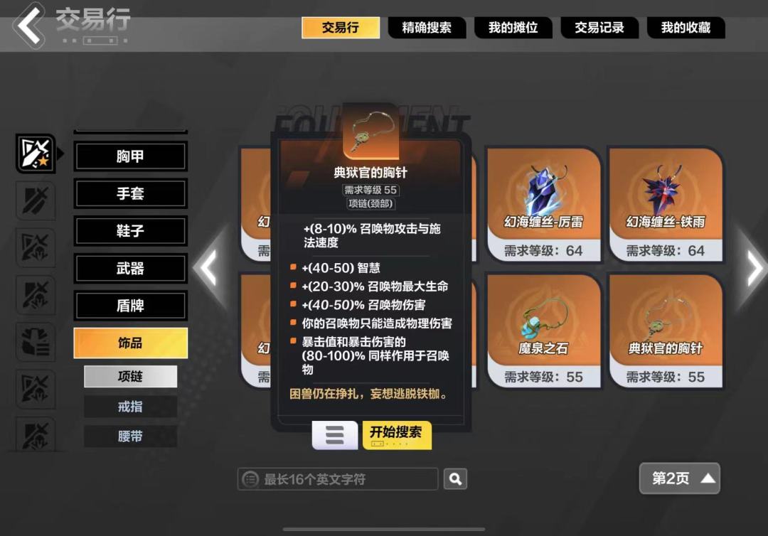 2、打造装备的底子等自己掉落也不现实,就要利用好交易所筛选功能,就拿饰品举例子,在精确里面打出关键字会自动出现相关词条,选择即可,我们选择召唤物伤害加一种抗性,并点击词条自定义数值,这里召唤物伤害我填的60,冰冷抗性30,可塑性填的90,必须加一条可塑性大于90,因为没有可塑性是打造不了词条的,交易所有大量的强化后的废品上架,这些都被用光了可塑性,看上去有几个好词条,但完全改造不了。