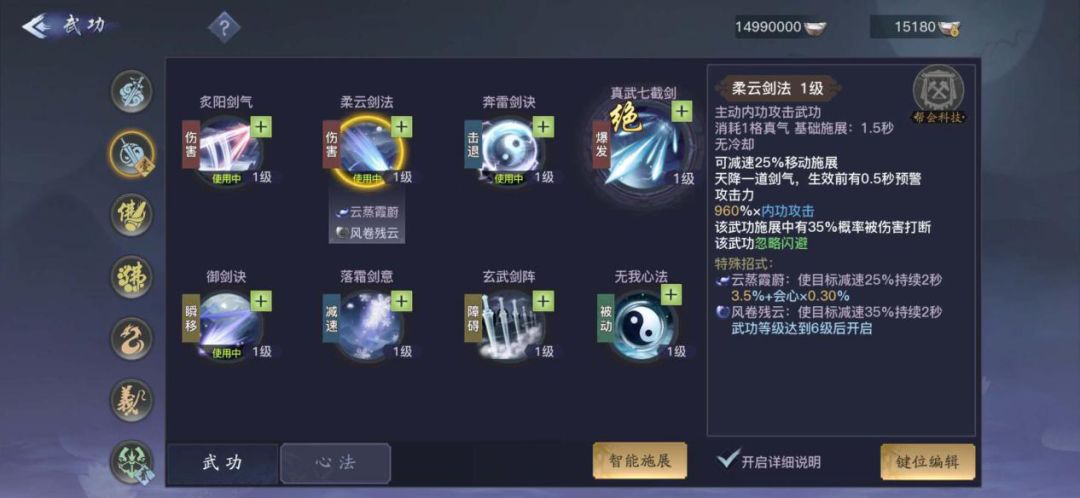 NO7:柔云剑法,主动伤害技能,技能伤害中等,有1.5秒施展时间,无冷却。在伤害上比炙阳剑气低上很多,但是施展时间缩短了一半,可以移动施展,特殊招式是使敌人减速。有被打断的概率和预警时间,容易被敌人躲避。在功能性和使用频率上比较靠后,所以加点优先级排在第七位。