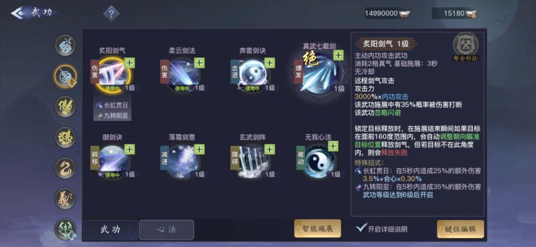 NO6:炙阳剑气,超强伤害技能,单论伤害的话是重霄伤害最高的技能,甚至比绝技伤害都高,远程施展的直线范围伤害技能,无冷却时间,但是有3秒的基础施展时间,受到伤害有几率被打断,特殊招式还会在5秒内造成额外伤害。超高伤害技能,但是有施展时间和被打断几率,需要有安全的输出环境。加点优先级排在第六位。