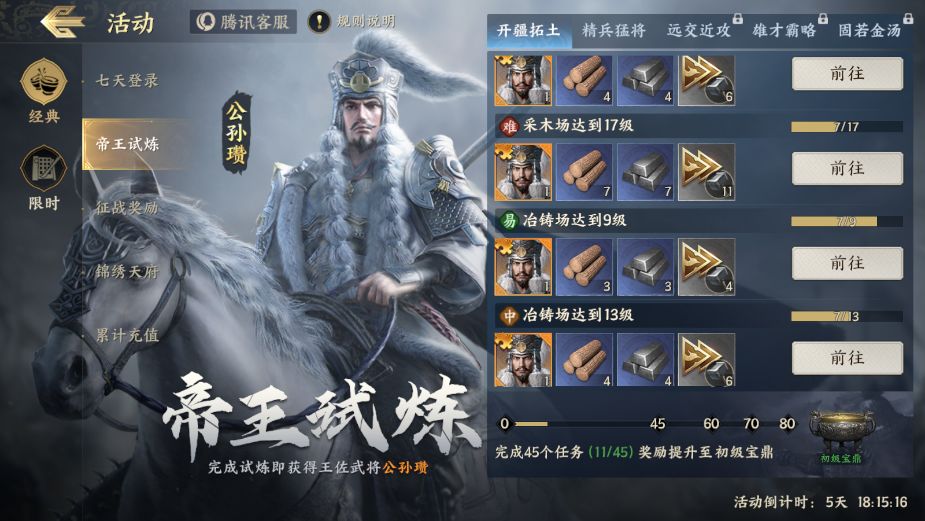 从上面我们可以总结出,前期优先升级公府、兵曹、资源建筑、学问署、军情院、政堂,这些建筑关系到我们的部队实力和资源获取,其次再根据本服情况或自身需求,升级医曹、仓廪、城墙和箭楼等。除了跟随任务去升级建筑外,还可以根据开服活动-帝王试炼有目的性去升级建筑,完成任务后可获得大量的资源奖励,能够更好的帮助我们前期成长。也要善用建筑工匠,初始默认只有一个工匠,主公可以购买建筑工匠,可达到同时建造升级多个建筑效率加倍,还可以使用加速道具或银锭加速升级。