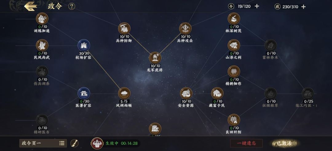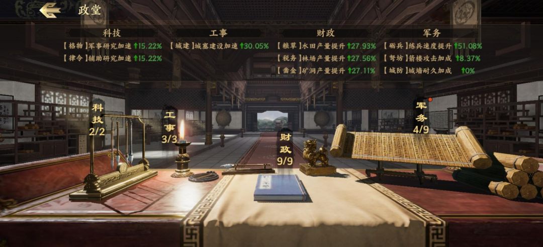 政堂:在这里您可以任命武将获得各类加成,包含科技、工事、财政、军务四大类,提升政堂等级可提升武将任命的数量和获得政令点。政堂也是解锁政令系统的建筑,政令点用于点亮政令系统的属性,类似天赋,可获得不俗的属性加成。政堂也是优先升级的建筑之一。科技包含:主要有军事和辅助科技研究加速,最多可任命2位武将;工事包含:主要有城寨建设加速,最多可任命3位武将;财政包含:主要有水田、林场、矿洞产量提升,最多可任命9位武将;军务包含:主要有练兵速度、箭楼攻击、城防耐久,最多可任命9位武将;武将的政务点数越高,任命时获得的提升效果越好,在这里蓝紫将也能发挥出重要的作用。您可以根据您实际需求,将政务最高的武将任命到您想要的加成类型中,需注意卸任武将的时候,该武将会进入30分钟的冷却时间不能被任命。