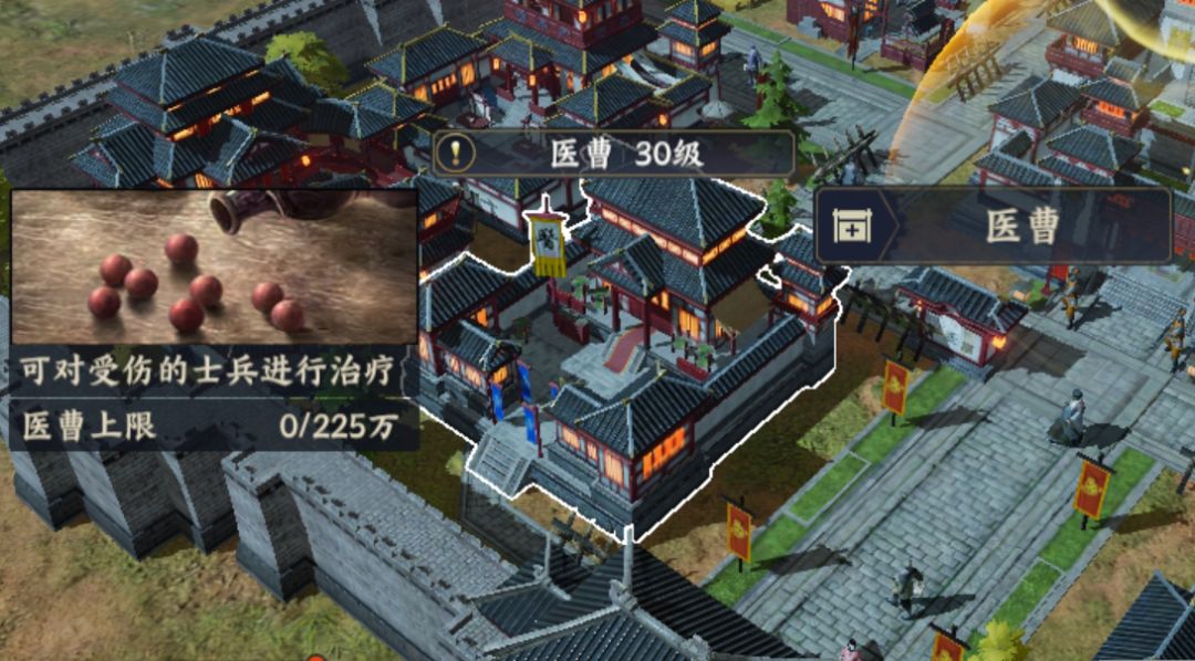 医曹:治疗伤兵的建筑,最高30级,治疗伤兵需要消耗粮草。提升医曹等级可提升容纳伤兵上限、每日免费粮草额度,治疗速度、治疗减免粮草比例。在开荒期一般战争冲突少,大规模伤兵概率较低(除非极限开荒),在前期医曹的升级优先级不会特别高,升到其他核心建筑升级的前置等级即可。中后期有大量战争的情况下医曹的作用尤为显著,中后期需要重点升级。需注意当伤兵超过医曹容纳伤兵上限时,超过的部分伤兵就会死亡。战后受伤的士兵不会自动恢复,需返回归属地后进入医院才会接受治疗,所以当您发现医院快满时,惨伤部队可暂缓在外面不回城,已免医院爆兵。