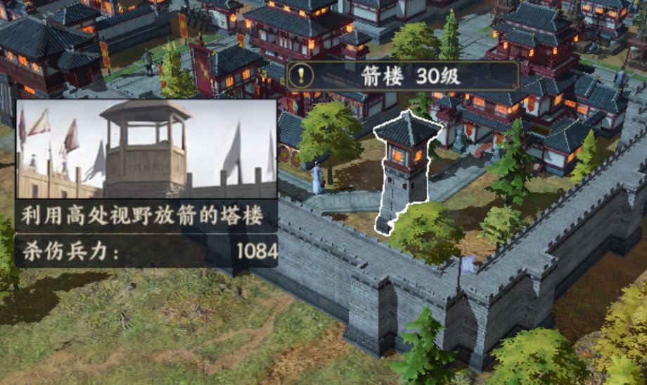 箭楼:城墙一样用于抵御外敌,每隔一段可对进攻我方主城的敌军造成固定伤害,最高30级,提高等级可以提升固定伤害值。可根据所在服务器情况决定,如果服务器比较和平,升级优先级不高,如果服务器掠夺激烈,可对应提高优先级了。